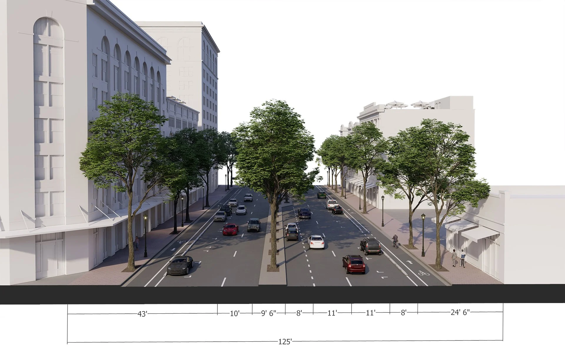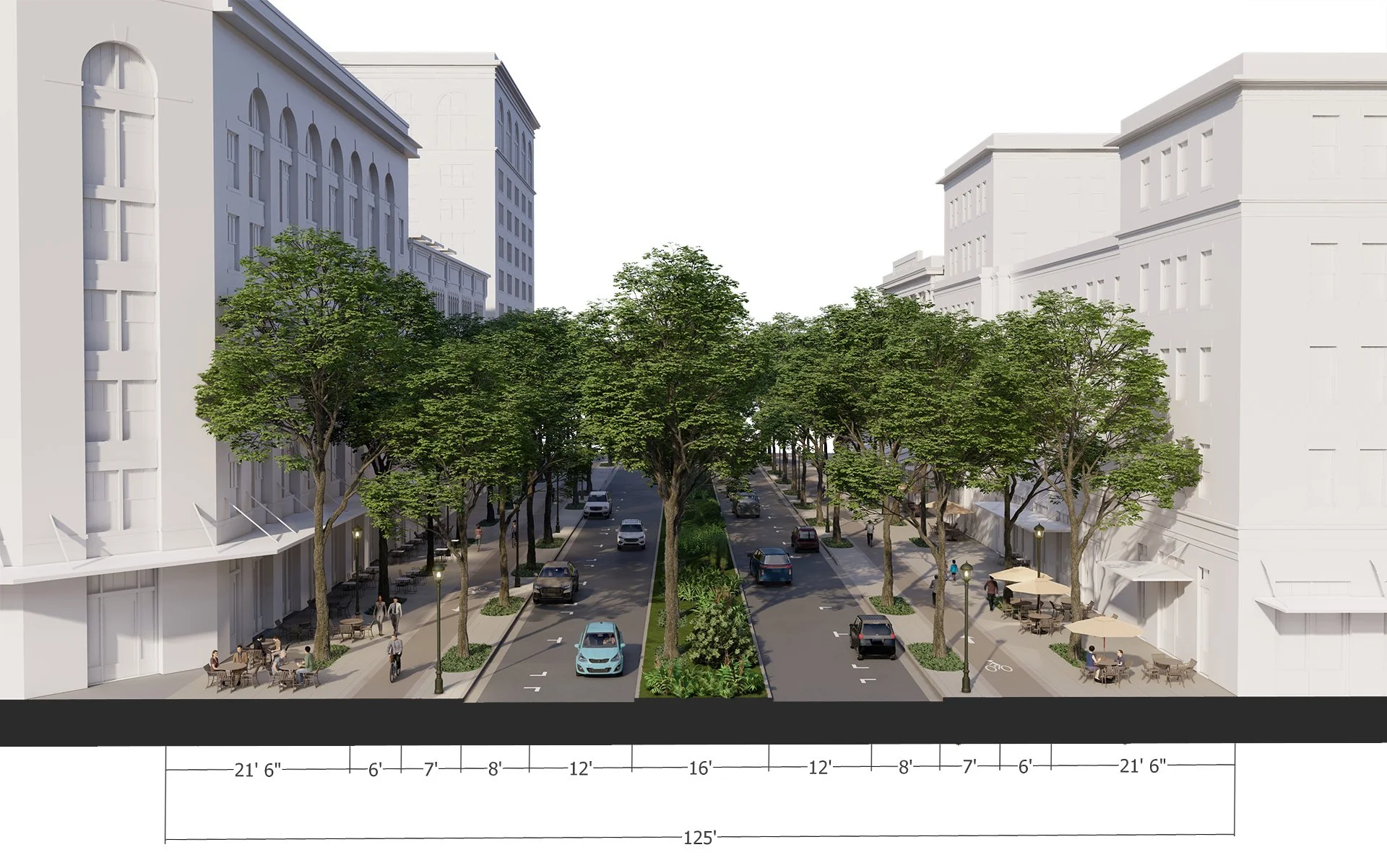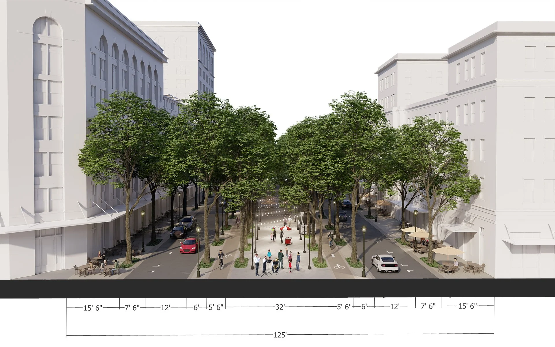 From January 9 – 13, 2023 a team of urban designers and town planners from Dover, Kohl & Partners worked on-site in Downtown Chattanooga gathering input, creating visualizations, and testing design ideas for Reimagining Broad Street. Centered on the themes of safer, greener, and livelier, three draft options emerged highlighting possibilities for the future of Broad Street. Each option reduces the amount of space used for moving and storing automobiles, while presenting a range of options for enhancing the pedestrian space.